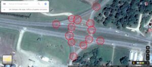 A pesar de que la ruta 1 tiene tránsito en un único sentido, el cruce ofrece 6 áreas de intersección de trayectorias, lo que determina un elevado incremento del riesgo de colisión.