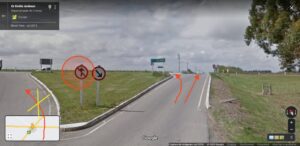 Como pueden ver en la imagen del cruce donde ocurrió el siniestro mortal, de la ruta 61 con la ruta 1, ramal bypass, es un cruce con diseño asimétrico, diferente al cruce de la misma ruta 61 con la ruta 1 en el ramal urbano, a pesar de estar a ambos a poca distancia.
