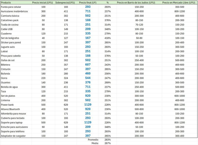 - Ahora bien, los costos fijos los incluyo como un número global, los costos operativos los incluyo por unidad vendida (que asumo que fueron todas). Y agrego un multiplicador de 5/3 sobre el costo unitario para atender a la rentabilidad total querida (recuerden, 50% del costo de venta de los artículos). Y finalmente calculo la diferencia entre el precio de venta (sin IVA) y el precio inicial y le pido a Grok que busque en las ofertas del Barrio de los Judíos y de Mercado Libre productos similares para comparar los precios.