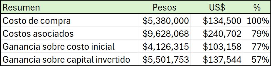 Para ver las conclusiones es útil hacer una tablita que incluya el costo inicial, que llamaremos el 100%, el costo operativo que incluye al socio Estado que cobra su tajada mediante los impuestos y, finalmente, la ganancia, expresada tanto sobre el costo inicial como sobre la inversión total de capital. Esta es la tabla: