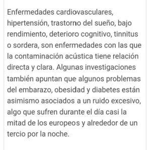 Otro factor muy importante a tener en cuenta, es que la exposición crónica al ruido, que es lo que sufren la gran mayoría de los habitantes de Montevideo (más del 90%) es un factor que daña la salud del ser humano, provocando un sin número de enfermedades y deterioro de la calidad de vida, a través de trastornos del sueño, deterioro de la concentración, estrés crónico, deterioro del sistema inmunitario, mayor incidencia de cáncer y demencia, entre otras afecciones.