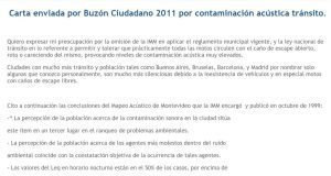 Carta enviada por Buzón Ciudadano de la IMM por la contaminación acústica en el tránsito. Año 2011
