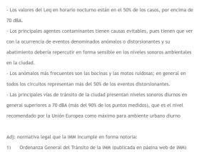 Cuando se observan los resultados de las mediciones de los niveles de ruido derivados del tránsito en Montevideo, se observa que desde hace casi 30 años en el 90% de los puntos diurnos medidos, los valores estaban por encima de las recomendaciones o estándares internacionales.