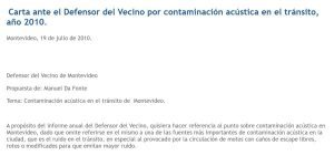 Carta enviada a la Defensoría del Vecino en el año 2010, una década después de publicado el primer informe sobre la contaminación acústica por ruido en el tránsito en Montevideo.