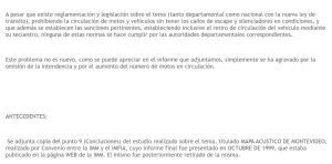 La otra conclusión destacada del estudio, es que más de la mitad de los eventos anómalos (que son los que determinan los niveles elevados de contaminación acústica) están vinculados a los caños de escape ruidosos de las motos y al uso de bocinas. Ambos elementos claramente evitables con una fiscalización adecuada, persistente, y eficaz, que retire de circulación a las motos con caños de escape adulterados y ruidosos.