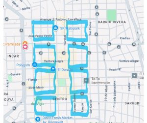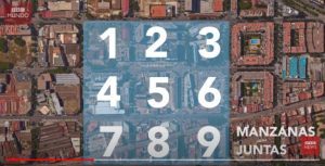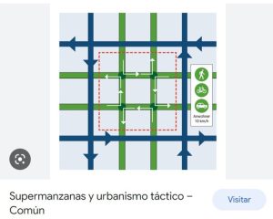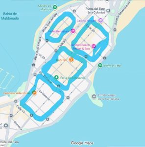 . Plan de supermanzanas para el centro de Maldonado y para la Península. La configuración en damero genera múltiples entrecruzamientos cada 100 mt. y hace posible que dos vehículos que vayan de un punto A a uno B, puedan hacerlo con diferentes trayectos y se entrecrucen muchas veces, multiplicando los riesgos de choque.