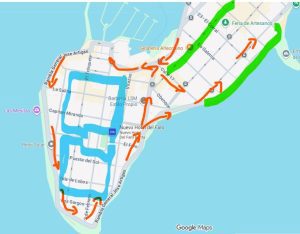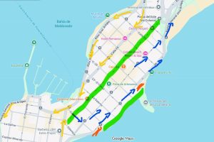Gorlero y una zona de la rambla (en verde en la imagen) pasarían a ser calles exclusivamente peatonales. En azul las supermanzanas. Las flechas muestran cómo quedarían las calles de ingreso y salida a la península, estableciendo una circulación circular de ingreso y salida, eliminando los múltiples entrecruzamientos actuales, que determinan el ingreso y salida establecidos en cada uno de los lados de la península.