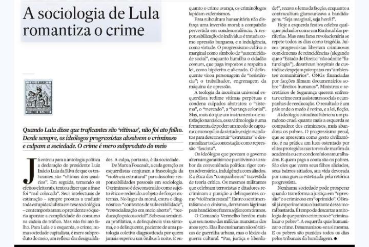 Ya entró en la antología política la declaración del presidente Lula da Silva de que los traficantes son “víctimas de los usuarios”. Enseguida, temiendo los efectos electorales, intentó decir que fue una frase «mal colocada». Sus intelectuales de cabecera – siempre dispuestos a traducir toda estupidez lulista en tesis sociológica- nos dicen que el presidente sólo quería apuntar a la complicidad del consumidor en la cadena del tráfico. Perro no fue un acto fallido. Para nos ofrecen una especie de manual para entender la complicidad del consumo en la cadena del tráfico. Pero no fue así. Para Lula y la izquierda, el delito, en una sociedad capitalista, es un mero subproducto del medo, un reflejo de las desigualdades. La culpa, por tanto, es de la sociedad.