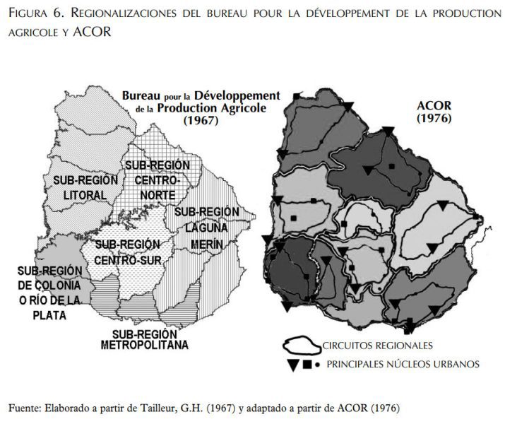 En esa misma década, que ya se ve que fue fructífera en propuestas, el Bureau pour la Développement de la Production Agricole (TAILLEUR, G. H. (1967): Planification Régionale en Uruguay (Voies et Moyens). Rapport de mission de coopération technique. Bureau pour la Développement de la Production Agricole.) propuso una estructura de seis regiones. Se basaba en la búsqueda de homogeneidades, investigación de polos de desarrollo, y definición de regiones-programa. El esquema, tomado de la misma fuente, se muesta en la figura de la derecha. En la imagen se muestra también la propuesta de ACOR, basada en la del Bureau, pero con énfasis en circuitos regionales. La propuesta final dibujaba ocho regiones basadas en otros tantos “circuitos regionales” reales, más otras dos: la metropolitana y la de la zona de