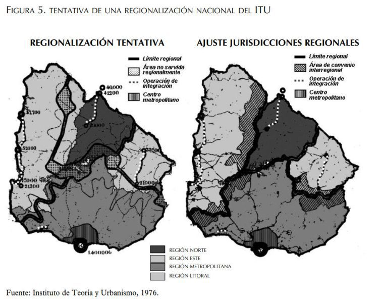 Para mencionar sólo los intentos modernos de regionalización, tenemos en 1962-1963 el documento del CLAEH junto con CINVE (CLAEH-CINAM (1962): Situación Económica y social del Uruguay Rural. Montevideo; CLAEH (1963): Interpretación del Uruguay Rural. Extracto del estudio Situación Económica y social del Uruguay Rural. Montevideo, CLAEH) que proponía una regionalización en base a áreas locales. Fracasó. Luego vino la CIDE en 1966, que si bien proponía escalas (nacional, departamental, local) no introducía cambios territoriales radicales. Fracasó. En 1967, el Instituto de Teoría y Urbanismo de la Facultad de Arquitectura de la Universidad de la República (ITU) presentó un documento (publicado en forma de libro en 1976) que proponía una descentralización regional a partir de centros funcionalmente integrados (ITU (1976): Tentativa de una Regionalización Nacional. Montevideo, Universidad de la República. División Publicaciones y Ediciones.). A la izquierda en la figura se muestra el esquema de regionalización tomado deYagüe y Díaz-Puente (2008). Fracasó.
