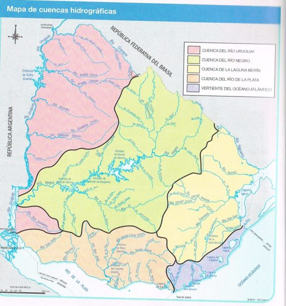 Otro punto cualitativo importante es el de la infraestructura nacional y las comunicaciones con otros países. La región I tiene el poderoso puerto en su poder. La región II tiene el puerto de Nueva Palmira y el (futuro) puente Colonia-Buenos Aires. La región III tiene el aeropuerto de Carrasco y el acceso a las represas de producción de energía del Río Negro. La región IV tiene el mismo acceso a la energía que el III, tiene la frontera seca con Brasil, acceso a la hidrovía de la laguna Merim y el aeropueto binacional de Rivera. La región V tiene los puentes hacia Argentina y el aeropuerto internacional de Salto, más el acceso a energía por el lado de Salto Grande. Y, finalmente, la región VI tiene el aeropuerto de Laguna del Sauce, el acceso a la hidrovía de la Laguna Merim, el puerto de La Paloma y el (futuro) aeropuerto en Rocha, además de frontera seca con Brasil. Es decir, todas las regiones tienen importantes infraestructuras de energía y comunciaciones y quedan mucho más equilibradas que los Departamentos ahora. Incluso desde el punto de vista de la hidrografía de Uruguay, que se ve en el mapa de al lado, la repartición de aguas está razonablemente asociada a las regiones que definí.