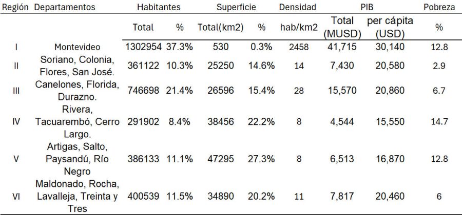 - Desigualdades persistentes: I domina (37% población, per cápita +46k pesos), vs. IV/V (24-26k, ajustado ~26-28k 2025), perpetuando centro-periferia (ingresos nacionales +10% 2025, pero brechas territoriales en pobreza/ruralidad). Superficie grande IV/V (22-27%) con baja densidad (7-8 hab/km²) complica administración (e.g., cobertura servicios en envejecimiento). Identidad local amenazada: Ignora rivalidades históricas (folklore/deportes), generando resistencia (como rechazos 2002/2012 propuestas fusión). Flujos centrados en I: ~70-80% comercio interno gravita Montevideo/III, sin datos desglosados para planificación (ausencia rastreo interregional INE/BCU). Déficits institucionales: Municipalización dispar (modelos gestión variados, déficits rurales); burocracia (e.g., solapamientos competencias); datos obsoletos (PIB 2011, ingresos proxy subestiman turismo VI). Centralismo residual: Recursos concentrados capital, limitando autonomía regional (e.g., programas FA/PN critican inercia colonial).