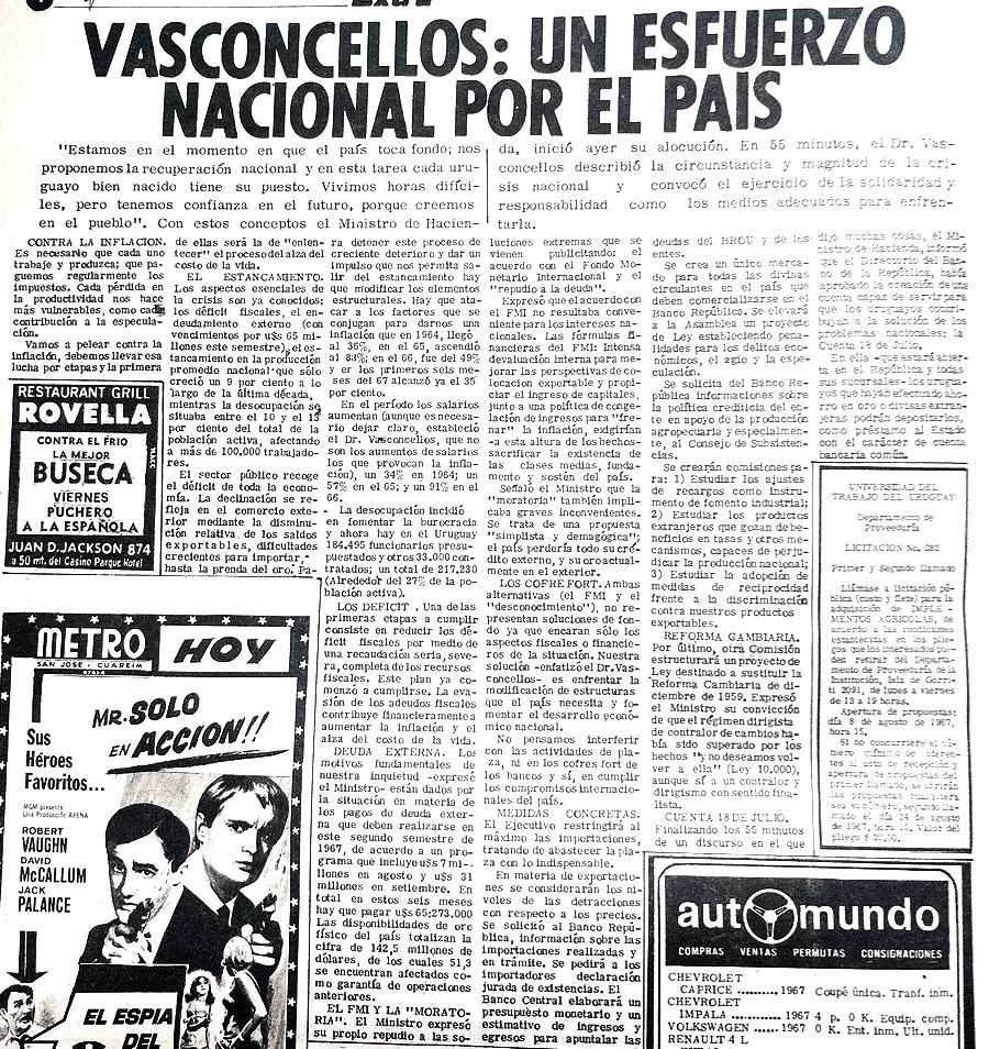 El domingo 16 de julio, dos semanas después de haber asumido el cargo, el ministro Vasconcellos dirigió un mensaje al país de 55 minutos de duración por la cadena de radio y televisión. Sus primeras palabras reflejaban la gravedad de la situación: «Estamos en el momento en el que el país toca fondo. Nos proponemos la recuperación nacional, y en esta tarea cada uruguayo bien nacido tiene su puesto. Vivimos horas difíciles, pero tenemos confianza en el futuro, porque creemos en el pueblo».