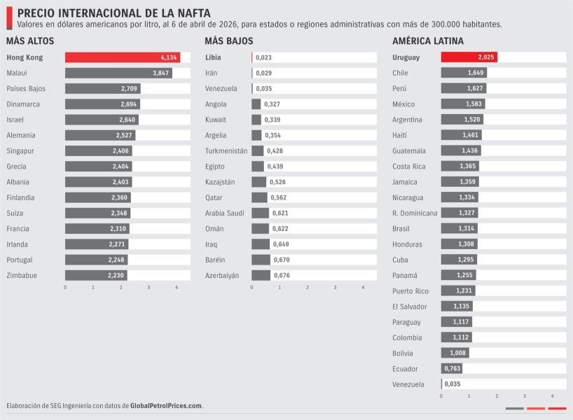Uruguay ofrece una paradoja fascinante y aleccionadora. Tiene una de las matrices eléctricas más limpias del mundo: en 2025, la generación eléctrica fue 98% renovable, y organismos de promoción del país destacan la alta calidad y confiabilidad del sistema. Sin embargo, ese éxito técnico no se tradujo automáticamente en energía barata para todos. En comparaciones regionales recientes, Uruguay aparece como el país con la tarifa residencial de electricidad más alta del Cono Sur; en el segmento industrial suele quedar entre los valores más altos de la subregión. Y en combustibles, el dato es todavía más brutal: la nafta uruguaya a más de US$ 2 por litro en abril de 2026, el valor más alto de América Latina en los rankings regionales de GlobalPetrolPrices.